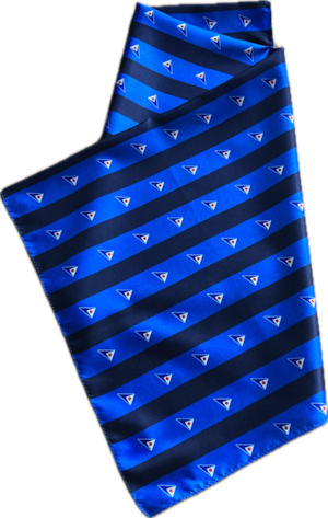 JSAFクラブタイとリンクし,青い海と空をイメージしたストライプにJSAFバージをあしらい、アレンジ可能なスカーフに仕上げました。